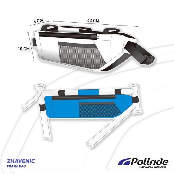 FRAME BAG POLLRIDE ZHAVENIC BLUE Lebar 8 cm / Panjang 43 cm / Tinggi 10 cm Bahan Menggunakan Cordura *Sesuai atau tidak nya ukuran Tas dari HEADTUBE Ke SEATTUBE tergantung bagaimana ukuran FRAME